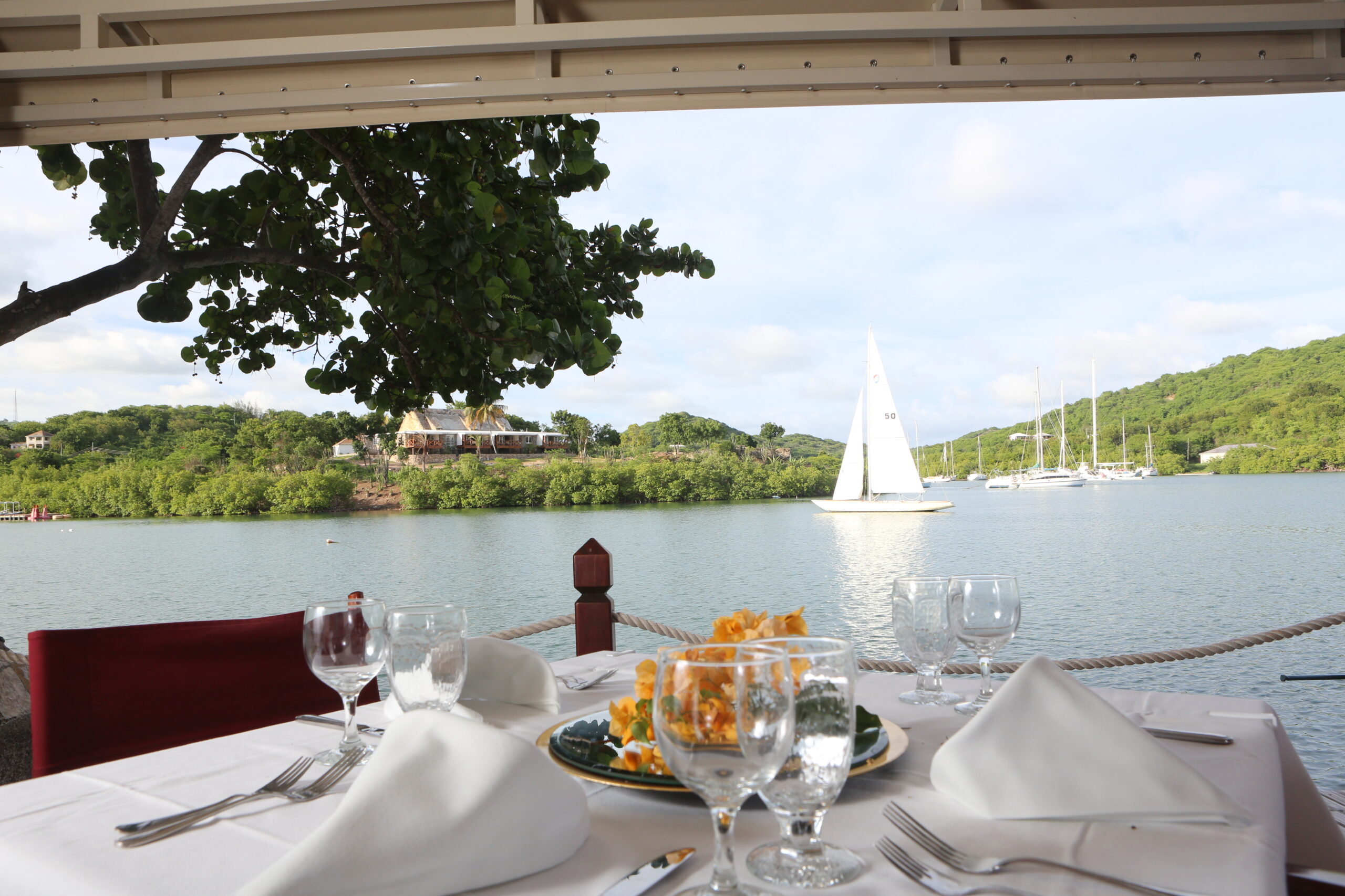 Our tree-shaded terrace is a delightful place to sit and dine, looking out over the water.
